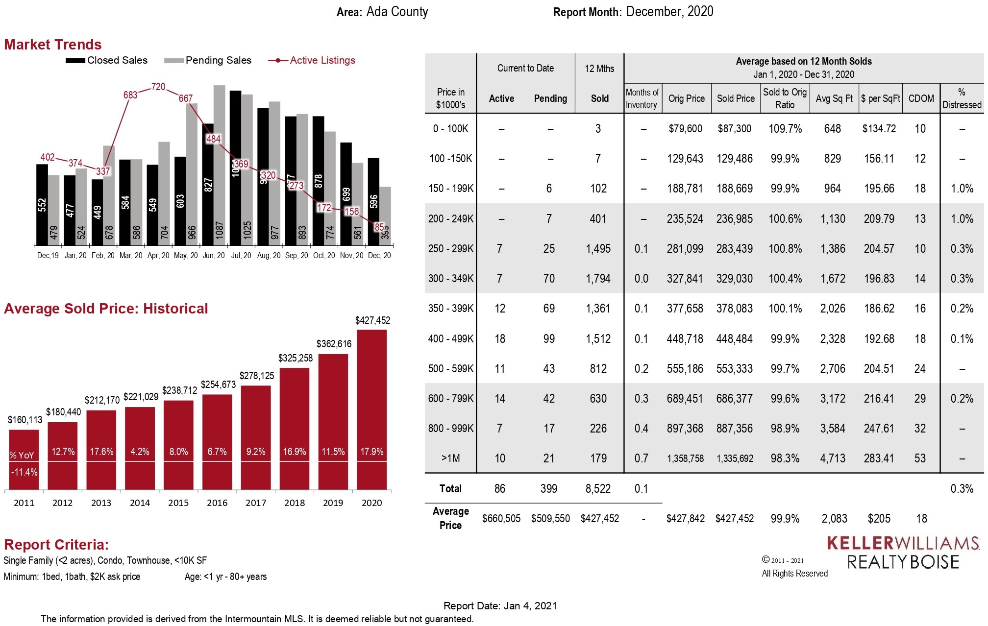 And, the price of that TP has hit an all-time high. The average sold price in Ada County in 2020, according to the lower-left graphic, was $427,452! Compare that to $160,113 in 2011.